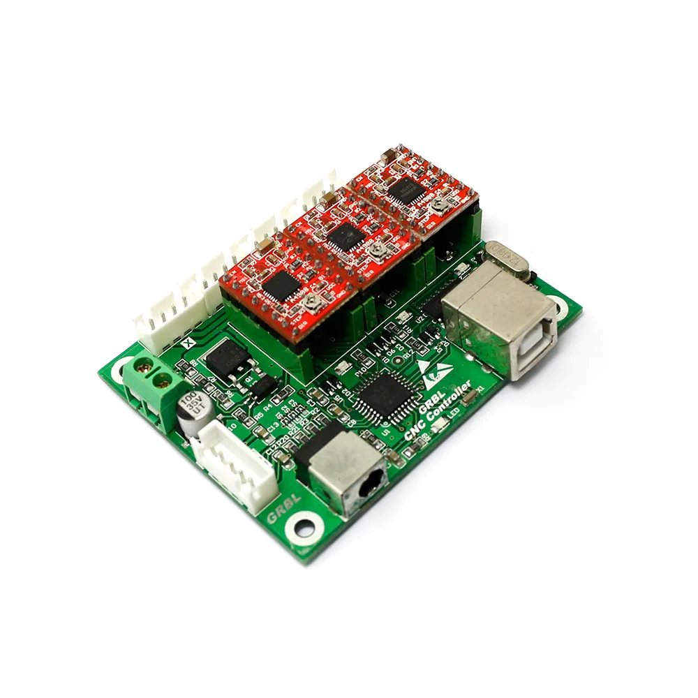 Connection: USB (USB-CH340)Applicable software: GRBL control, GRBL controller, UniversalGcodeSender or WeidiaoDashi, WeiDiaoGuanJianInput voltage: DC 12-36VCentral chip: Atmel 328PStepper motor drive: A4988Spindle / laser head drive: MOSFET (input Voltage 12-36V, 10A)Spindle motor interface output voltage = control panel power supply voltageSpindle PMW Speed: SupportSupport stepper motor: 12V, maximum current 2A (42or57 both ok)Laser engraving: supportPower interface: 5.5-2.1mm DC interfaceActually this board including a mother board and a driver
