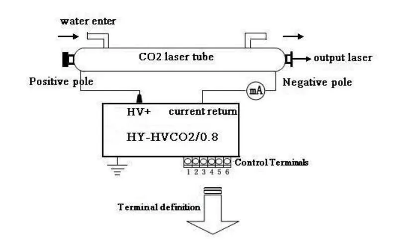 CO2 laser device. Current circuit of the power supply shall be connected to negative pole (laser