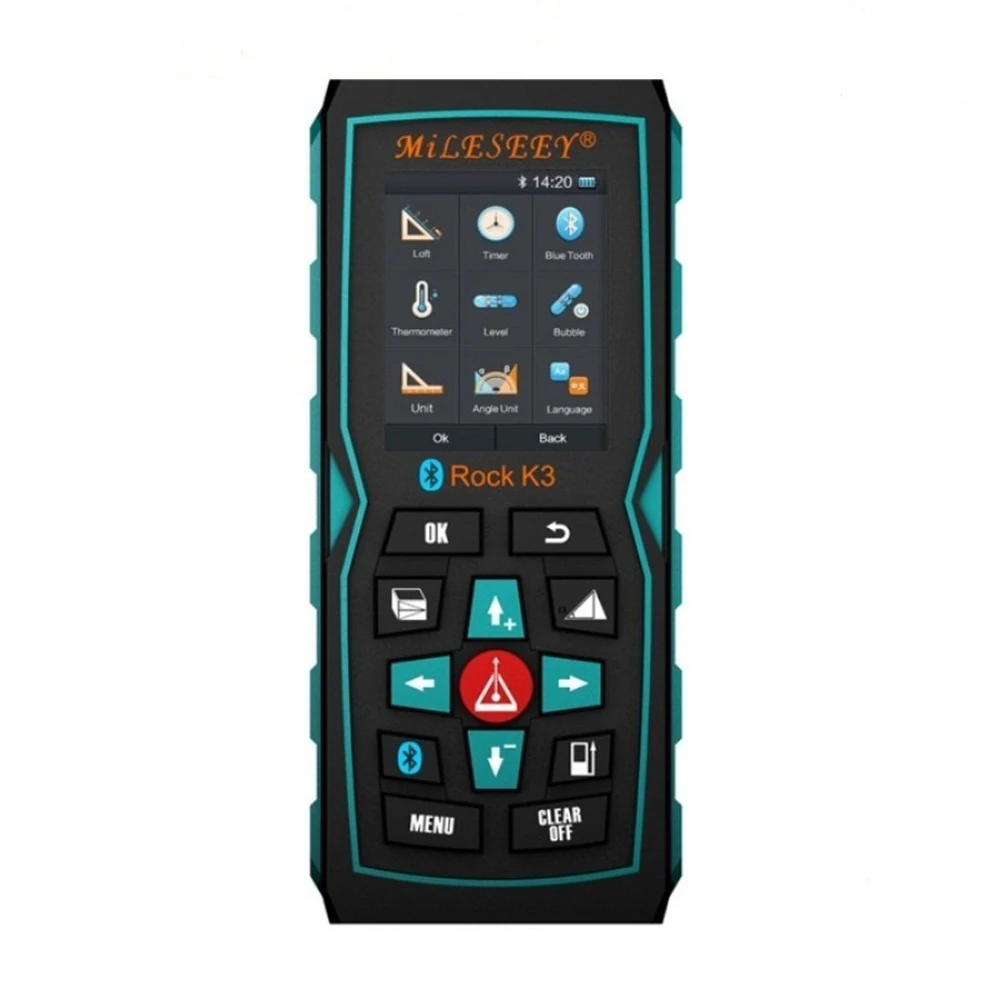 Long measuring range handheld laser distance meter, interactive interface simple operation, anti-slid desig;MOS System: mOS V2.2 measuring smart system with bluetooth transfer function. Mobile Distance Meter App, realise wireless intelligent control, 1000 sets data memory;Tilt Sensor/Auto level/Auto Height/Stake out;1/4 tripod thread, Backlit LCD display, IP65 waterproof. Smart MOS with TFT color display.Bluetooth 4.0 and mileseey sketch app. Screw hole for tripod;Bluetooth to connect app. Product Name:Mileseey K3;Laser class:class 2;Laser wavelength:635nm,Less than1mW. Min/Max measurement:yes;Area measurement: yes;Volume measurement: yes;Triple-cornered area measurement:yes.Long measuring range handheld laser distance meter, interactive interface simple operation, anti-slid desig;MOS System: mOS V2.2 measuring smart system with bluetooth transfer function.