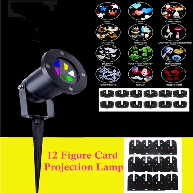 12 PCS SLIDES WITH 12 FESTIVAL PATTERNS: Christmas, Halloween, White Snowflake, Heart, Luck Clover, High Heel, Peace Dove, Maple Leaf, Birthday, Butterfly, Star, Clown. Ideal for interior and exterior walls, landscapes, dance floors.