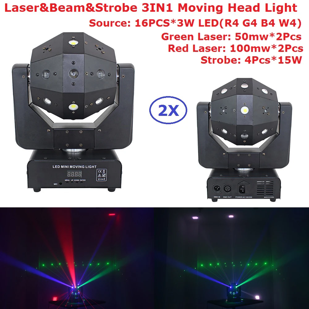 2Pack Newest 4X15W Strobe Beads + 16X3W RGBW Single Color LED Moving Head Beam Light With RG TWO Color 300mw Laser Lights For Dj, ship by DHL, UPS, Fedex, TNT or other ways according customer request and different countries rules.
