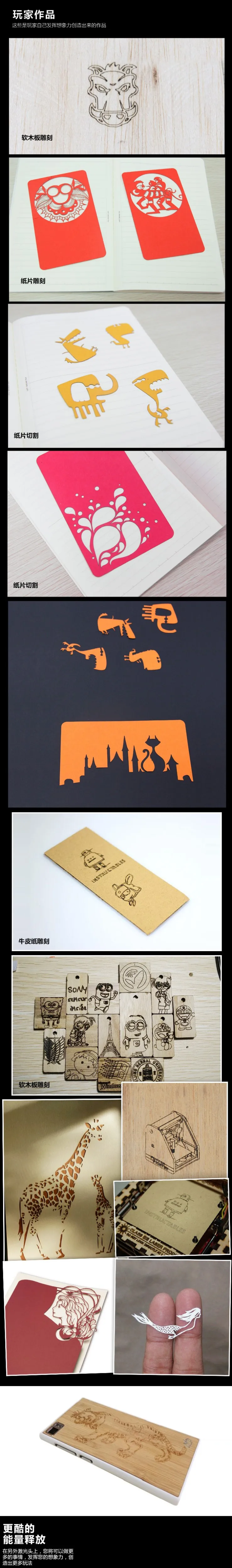 Advantage:1, the maximum engraving area of 17 * 20CM height limit2, no mobile gantry engraving table, does not limit the size of the object to be engraved height, can be placed directly on top of work * (such as directly on the table carving the desktop)3, the production of acrylic aluminum material + Also, on a more solid look tall4, comes with powerful cooling device can work long hours5, the software is easy to use, free upgrades for life. This paragraph engraving laser engraving machine is not available the following materials:Metal (regardless of thickness), stone, ceramics, jewelery, reflective material, a colorless transparent material, soft materialThis paragraph laser engraving machine can engrave the following materials:Wood, plastics, paper, bamboo, horns, and some cortex (purse), cell phone plastic shell, rubber stamp, photosensitive chapter, sponges, paperShipping list:A whole machineA laser protective eyewearA power supplyA USB computer connection line A set of Wrench engraving sample